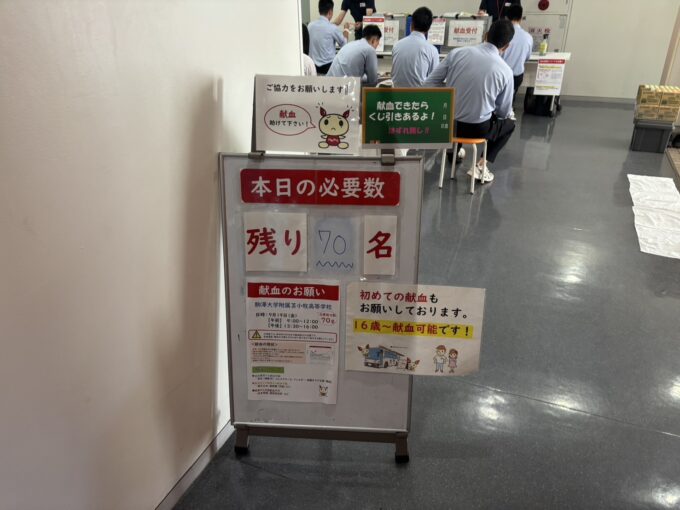 献血協力希望者を募り、保護者に同意を得た生徒をはじめ、一般の方々、本校職員の協力もあり、必要協力数である70名の献血を無事達成することができました。