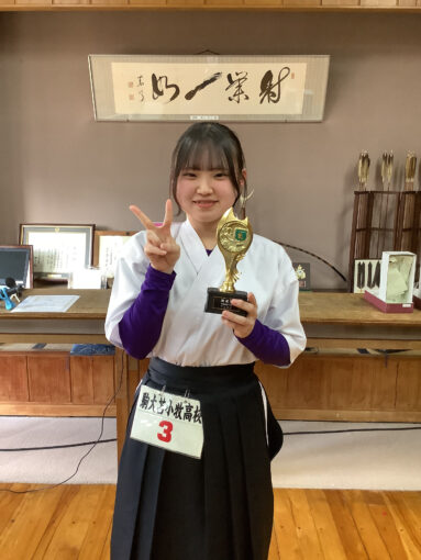 3月20日(金)、苫小牧市総合体育館弓道場において令和7年度第3回錬成射会が行われました。個人・団体戦どちらも入賞は逃しましたが、松田菓鈴さん(2年)がこの3回のトータルの的中率等を評価され、優れた選手に与えられる「錬成賞」を受賞することができました!この賞に恥じないよう、精進を重ねてまいります。
