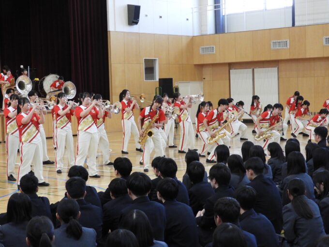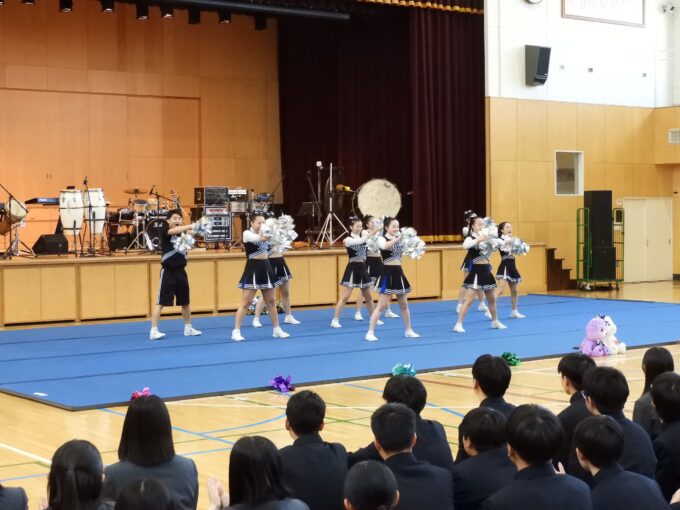 対面式では1年生代表のあいさつなどに加え、チアリーディング部と吹奏楽局による歓迎演技・演奏も行われました。