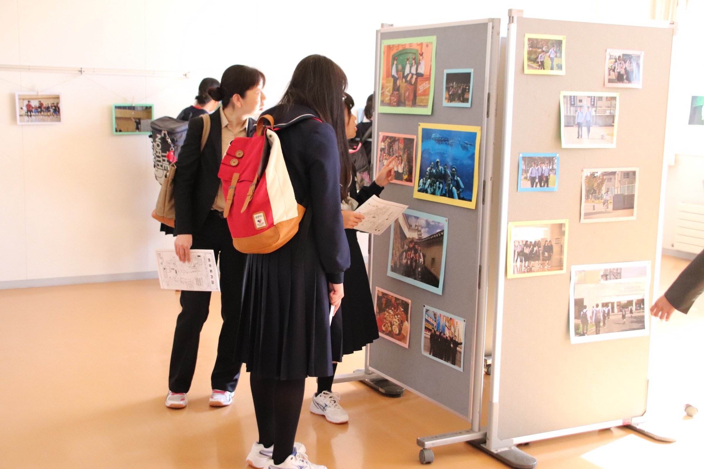 今回は、校舎見学から始まりました。写真同好会による写真展示や美術部の顔出しパネルなどの作成、そして司会・学校紹介・学校行事紹介など生徒が先頭に立って行う催しとなりました。