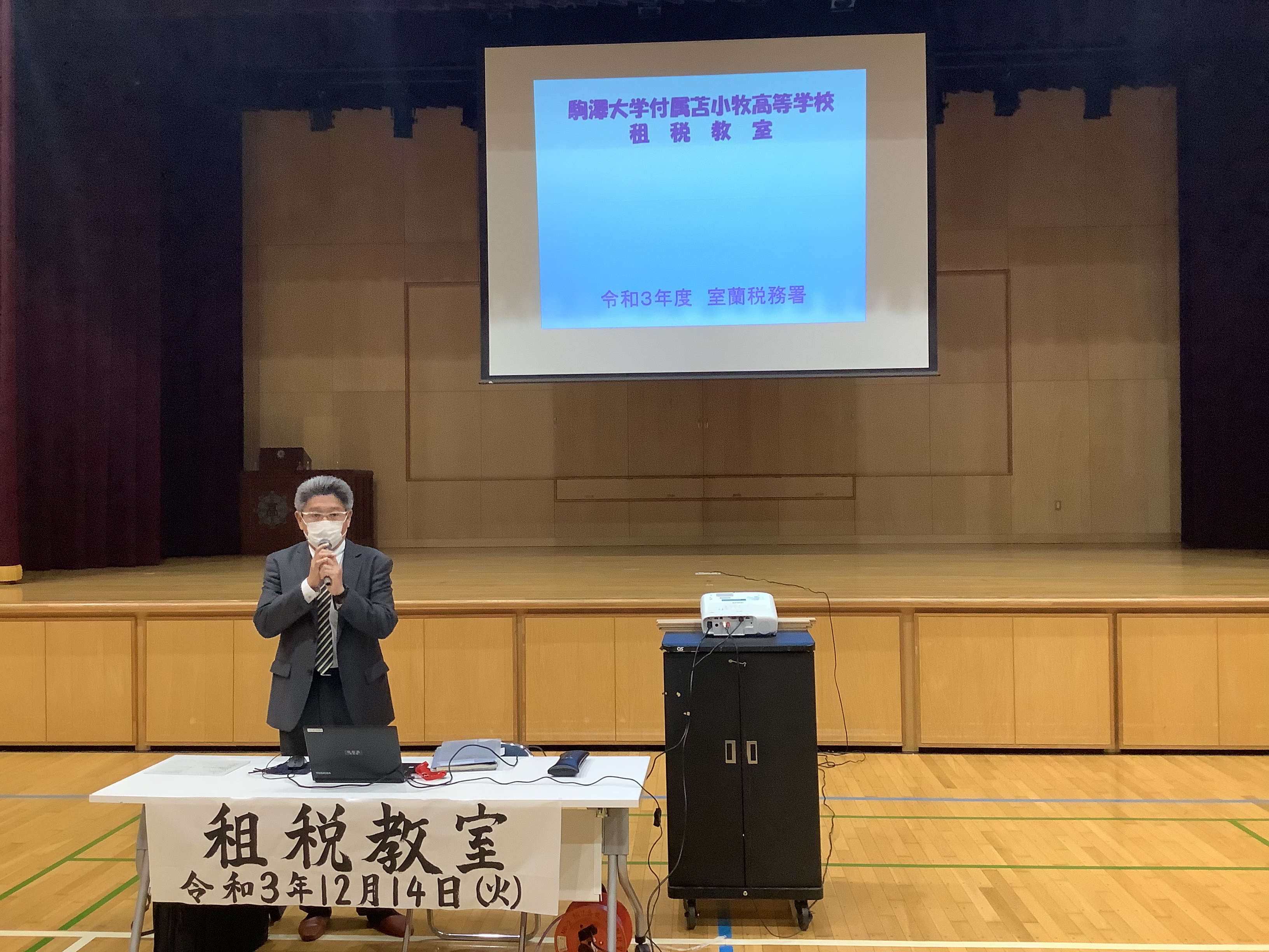 12月14日(火)、3年生を対象とした「租税教室」を室蘭税務署税務広報広聴官の永浜志朗様をお招きして開催しました。卒業まで3か月を切った3年生に対して、今の豊かな生活が税金により成り立っていることや民主主義の根幹となる租税の意義や役割を詳しく説明頂きました。授業とは違った視点で税金の重要性について改めて学ぶ機会となりました。